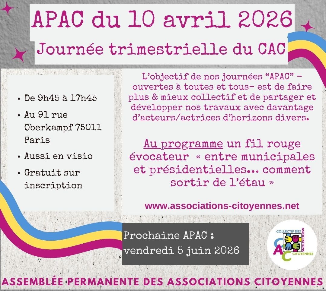 Les APAC (Assemblées Permanentes des Associations Citoyennes), organisées par le Collectif des Associations Citoyennes (CAC) sont des réunions publiques, ouvertes à tous.tes qui ont lieu tous les trimestres. Mixant plénières, ateliers, groupes de travail, elles accueillent les personnes et associations physiquement en Ile de France mais aussi de partout ailleurs grâce à la visioconférence. La journée du 10 avril prochain, à laquelle l'UFISC, membre du CAC, participera, aura pour fil rouge "Entre municipales et présidentielles… comment sortir de l’étau ?".