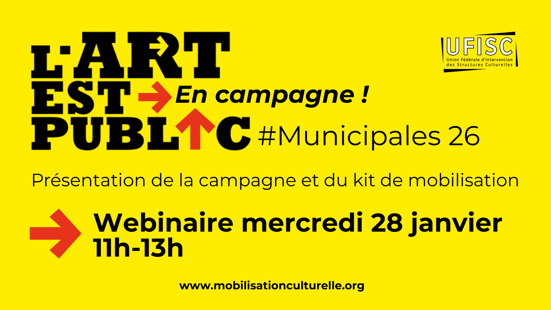 Rendez-vous le mercredi 28 janvier, en ligne, pour découvrir la campagne L’ART EST PUBLIC et son kit de mobilisation (supports de communication et visuels, questions aux candidat·es, ressources pour sensibiliser vos futur·es élu·es, …) !