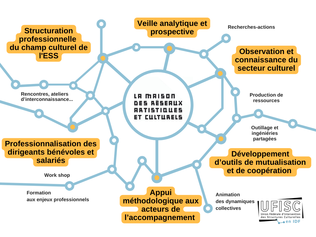La Maison des Réseaux artistiques et culturels est un lieu professionnel et solidaire, porteur de dynamisme et d’action, ouvert à la connaissance et à l’échange. Elle se développe comme un outil facilitateur et créateur de dynamiques sur le territoire francilien entre les organisations artistiques et culturels du territoire mais aussi plus largement avec leurs partenaires associatifs, institutionnels, de l’économie sociale et solidaire, de la recherche…