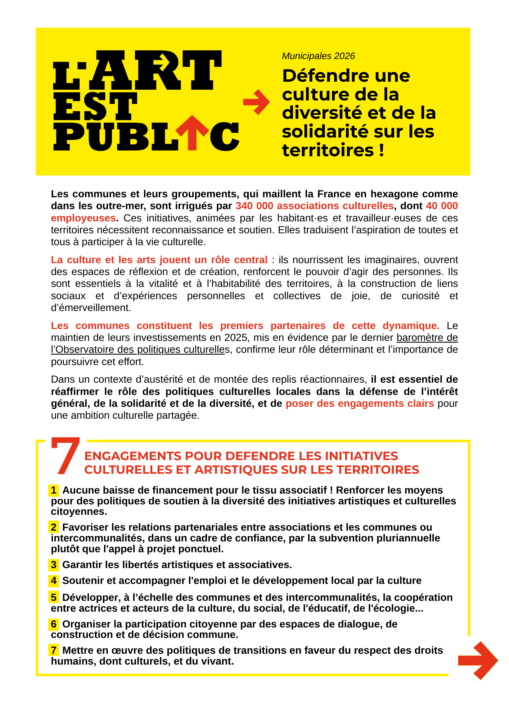 Temps de lecture : 2 minutes.Municipales 2026 : l’UFISC et L’ART EST PUBLIC proposent 7 engagements et un kit de mobilisation pour défendre une culture de la diversité et de la solidarité sur les territoires !